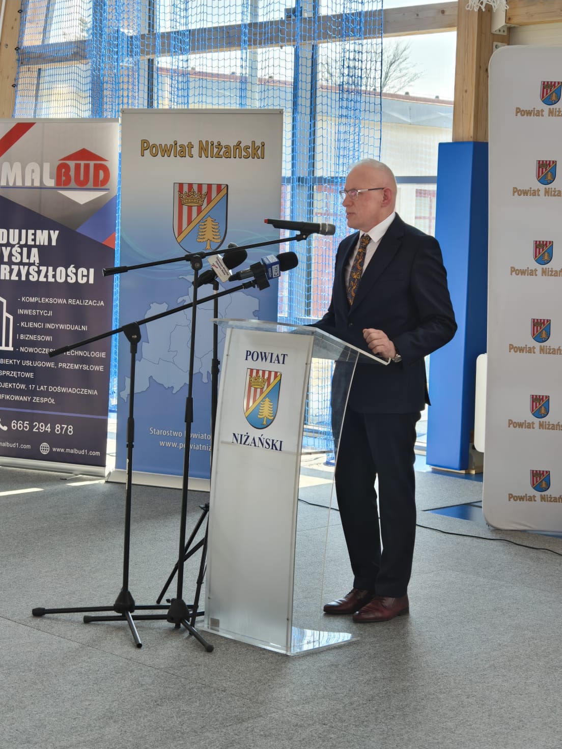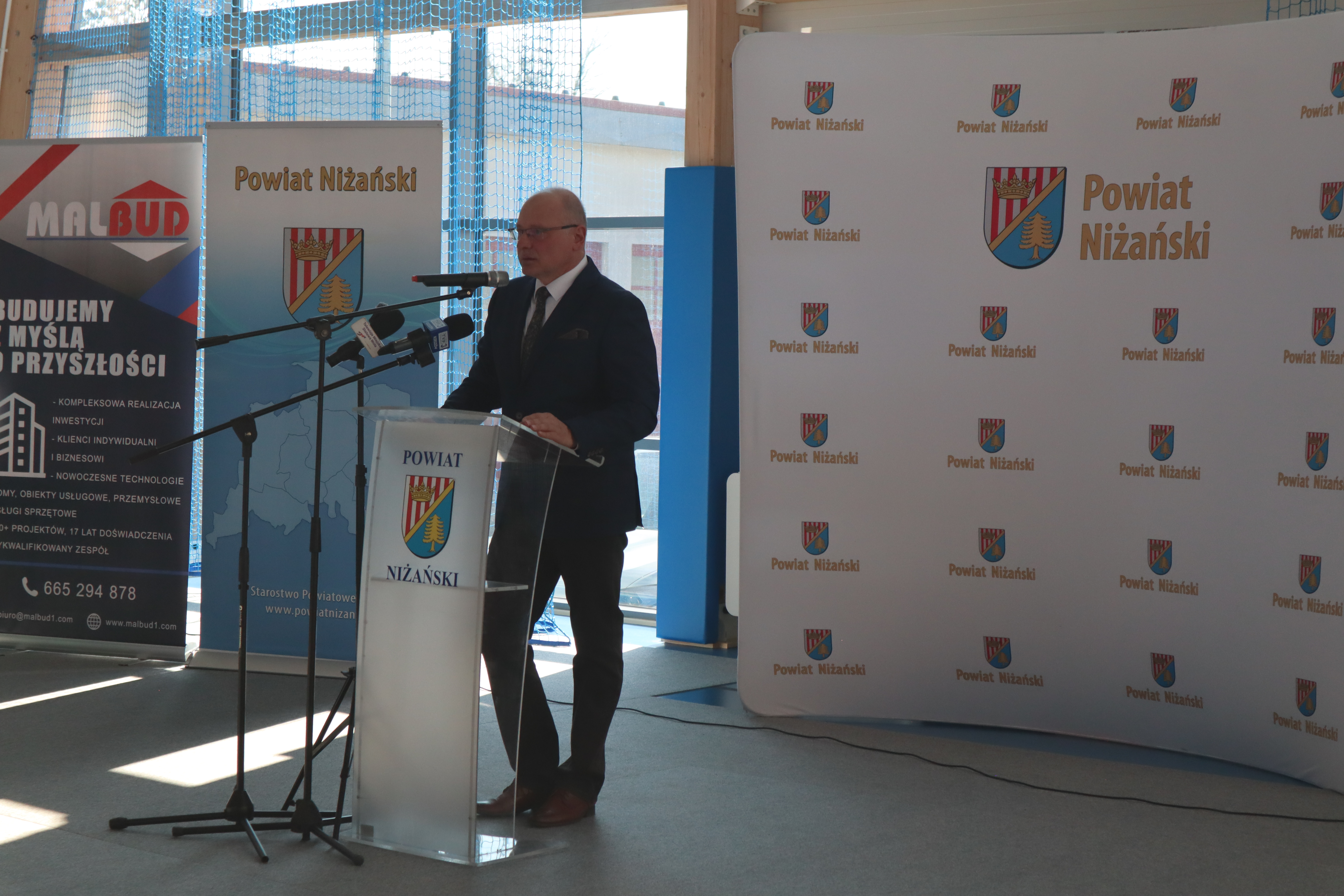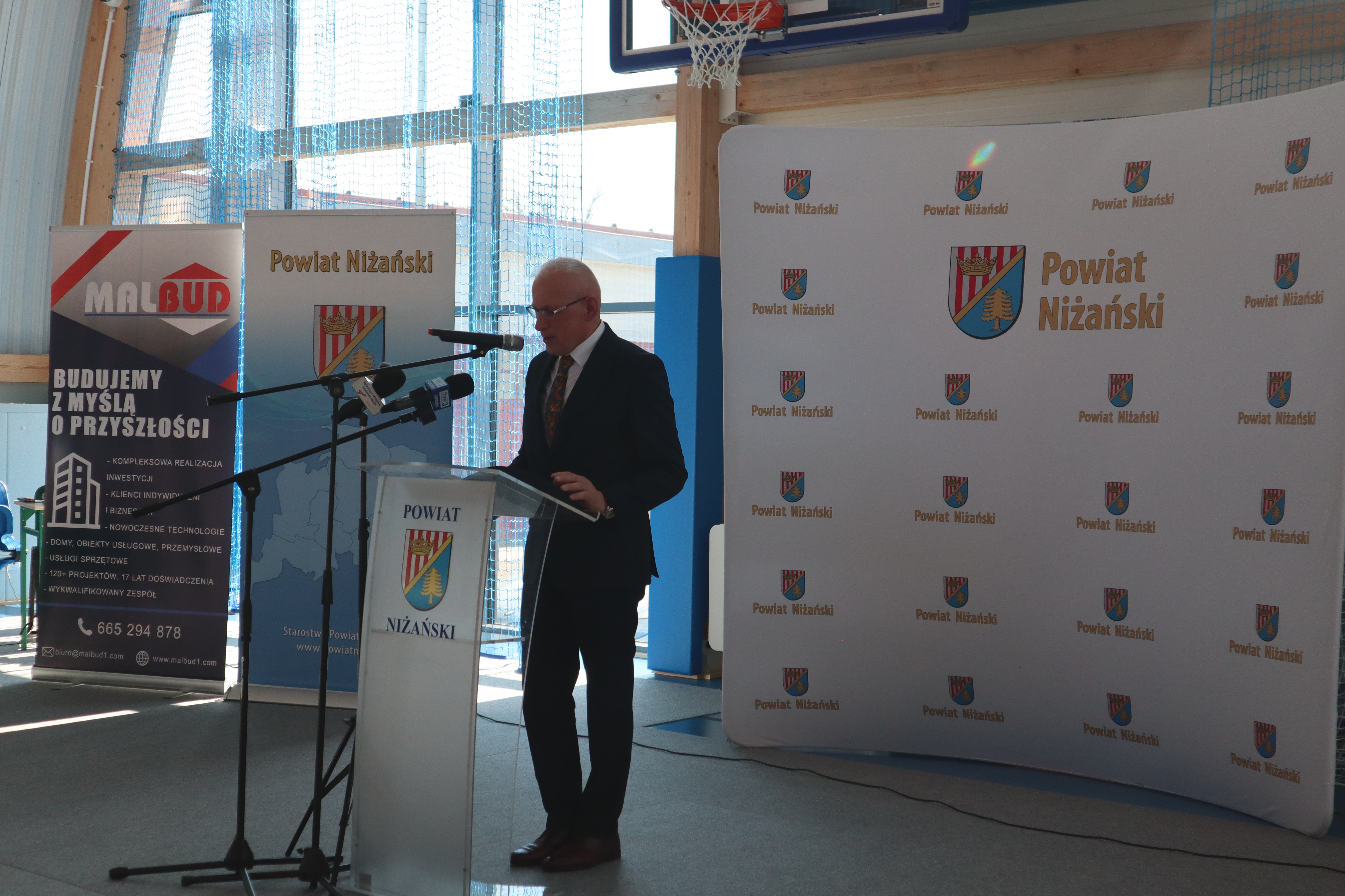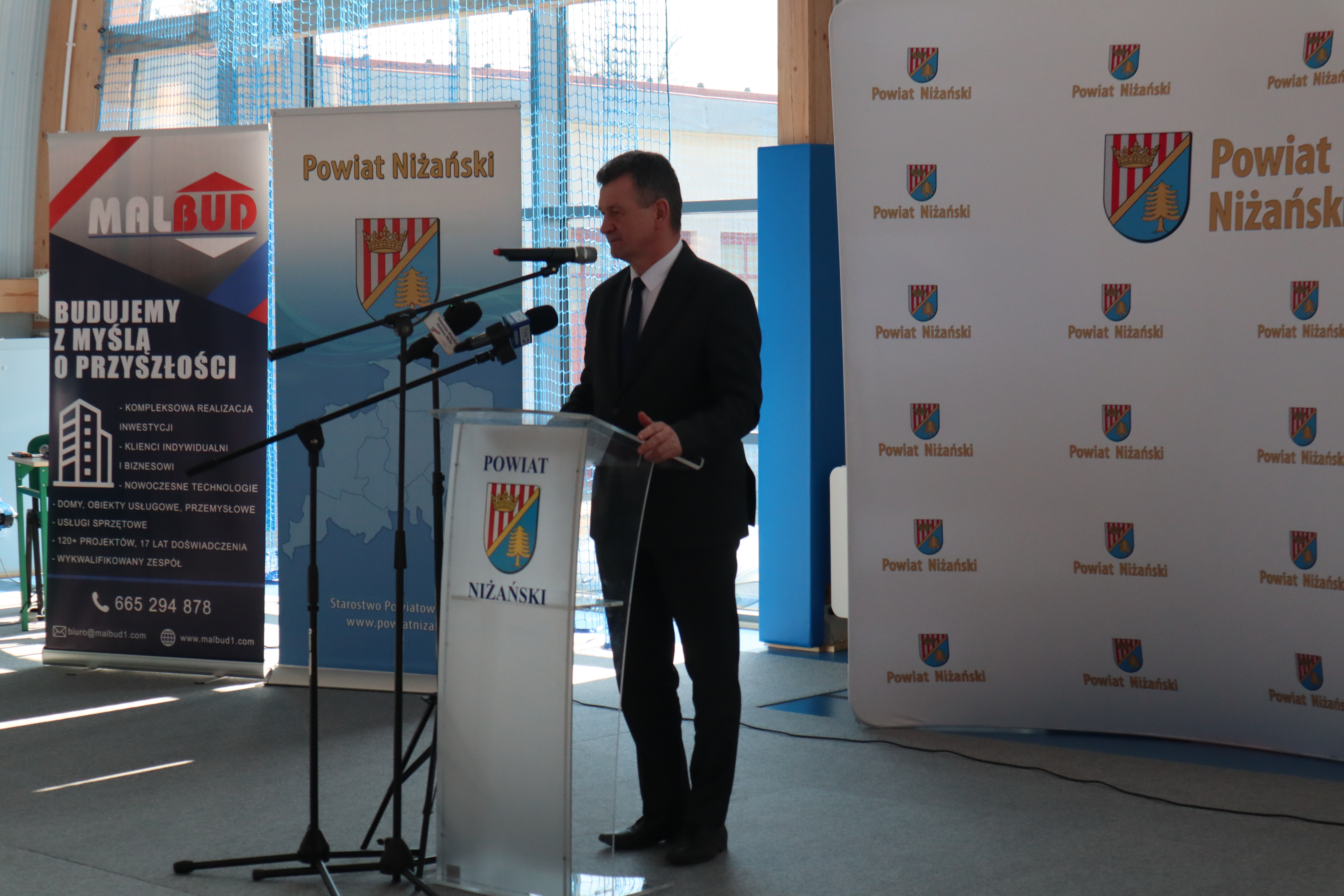 Złożył serdeczne podziękowania wszystkim, którzy przyczynili się do realizacji tej inwestycji: władzom samorządowym za wsparcie finansowe, wykonawcom za ciężką pracę oraz rodzicom, nauczycielom, pracownikom i uczniom za wsparcie i zrozumienie. Tu szczególne słowa uznania należą się dla Rady Powiatu Niżańskiego i Zarządu Powiatu na czele ze Starostą Niżańskim Panem Robertem Bednarzem, za podjęcie decyzji o budowie i współfinansowaniu inwestycji.